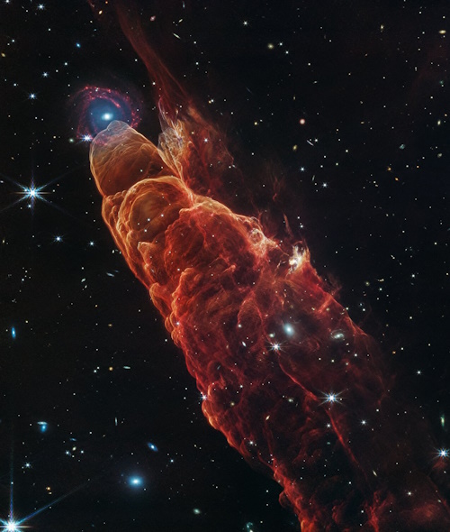 זה הרביג-הארו 49/50, זרימת סילון שיוצאת מכוכב שעדיין מתהווה. במקרה כל זה – שנמצא בתוך שביל החלב שלנו – משתלב בצילום עם גלקסיה ספיראלית רחוקה ברקע.
